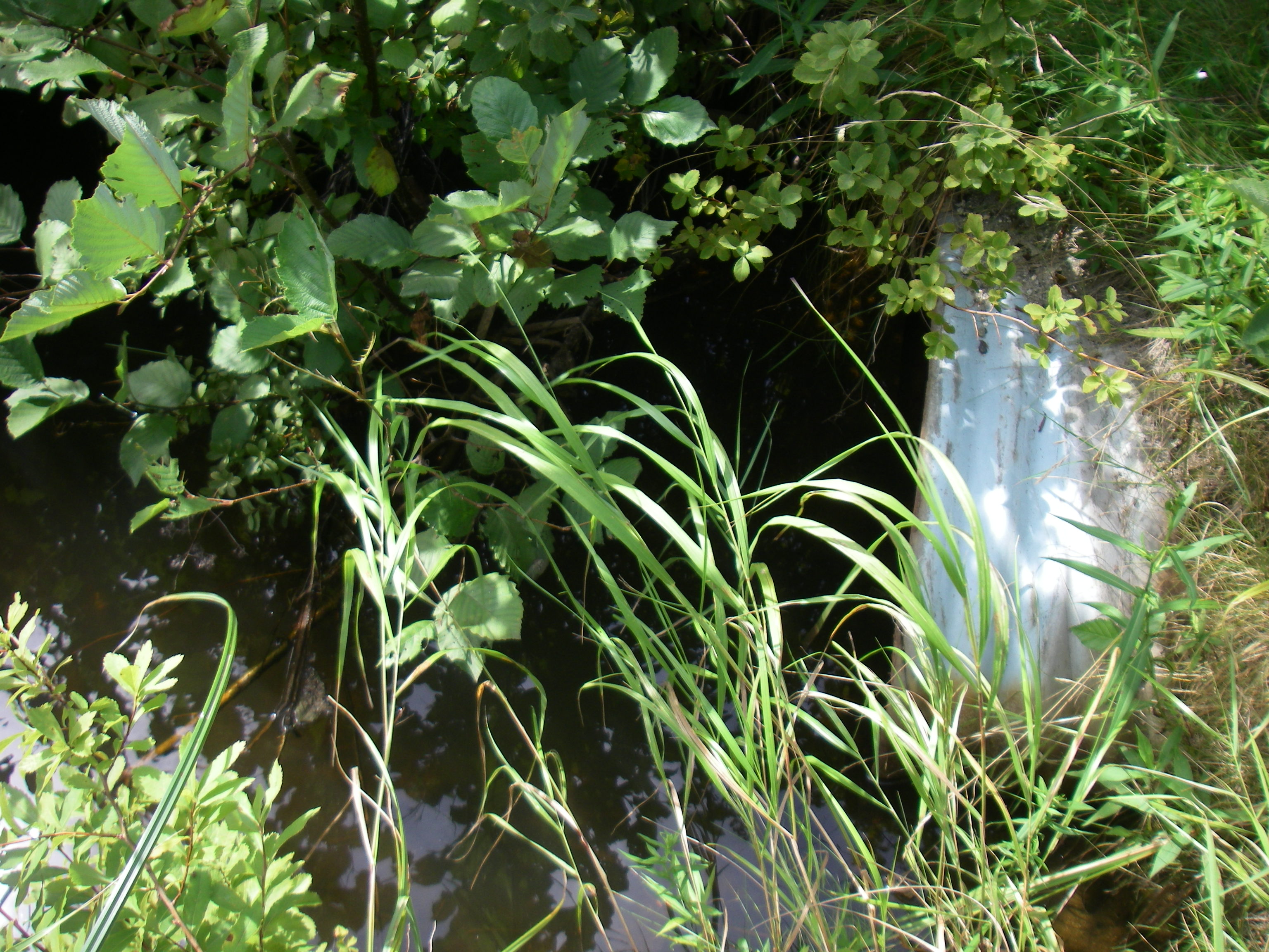 Photo of the downstream end of the East Branch Marshall Brook existing culverty. Note the width of the stream channel greatly exceeds the width of the culvert opening.