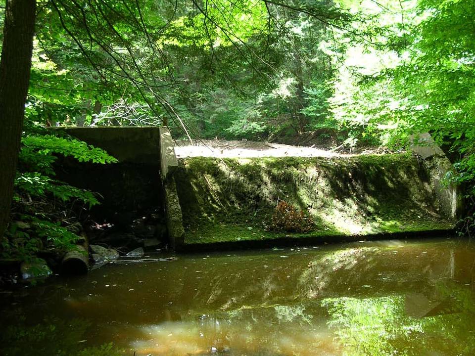 Looking upstream at the dam on Wetmore Run. No water is going over the spillway.