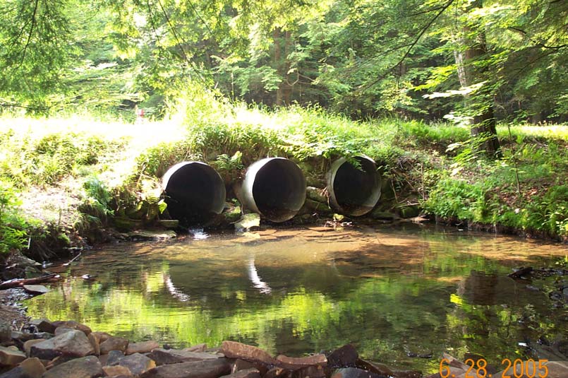 Photo showing the outlet for one of the culverts to be replaced in Bobbs Creek, Pennsylvania. Note the elevation between the culvert ends and the water level and the concentration of flow through only one of the three culverts.