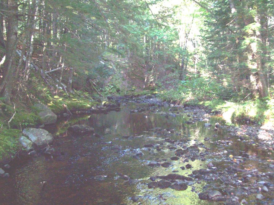 Photo of the Narraguagus drainage in Maine. View upstream of pretreated treatment sites. Note the clearly over widened stream, lack of habitat complexity and lack of large wood. This is a typical treatment site for downeast Maine.