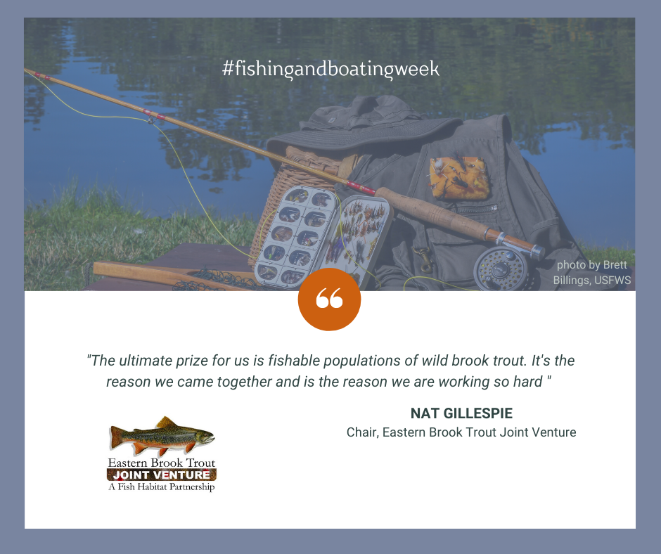 photo by Brett Billings, USFWS, showing stream, creel, fly rod and reel, vest, hat, box of flies.